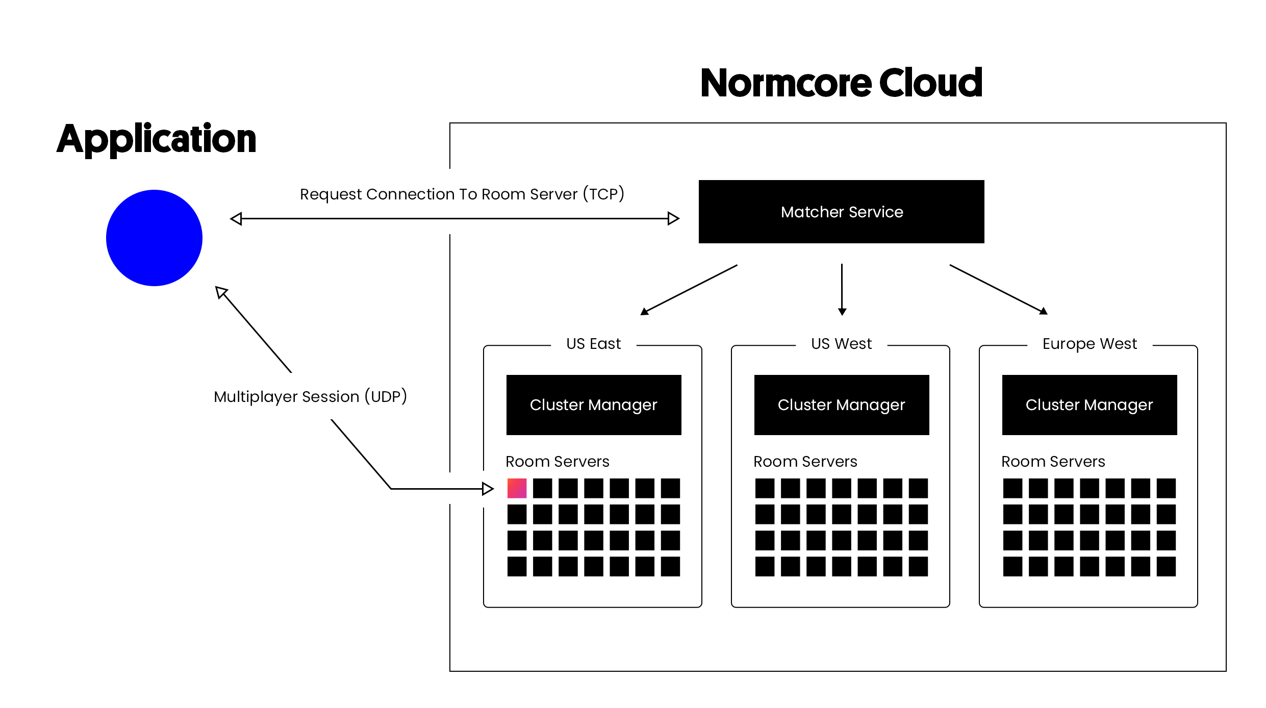 There are three components that make up a Normcore Cloud backend, the matcher, clusters, and rooms.