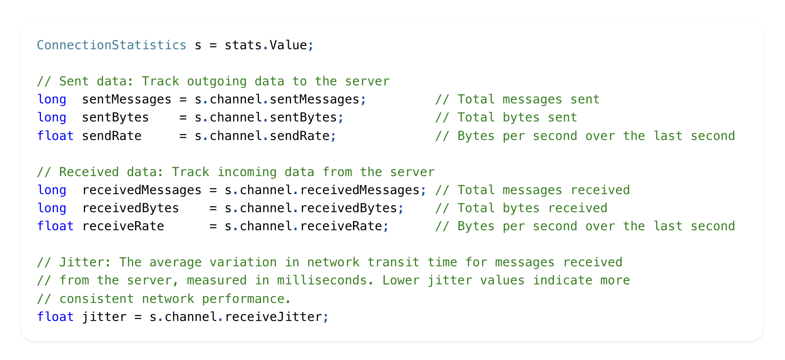 Our new Connection Statistics API can be used to measure ping, jitter, bandwidth, and more in real-time. Use it at runtime for matchmaking to determine if clients have a poor connection, debug connection issues in the field, or report connection stats to analytics.
